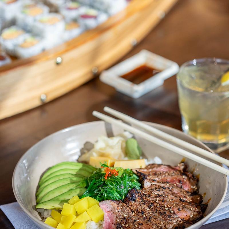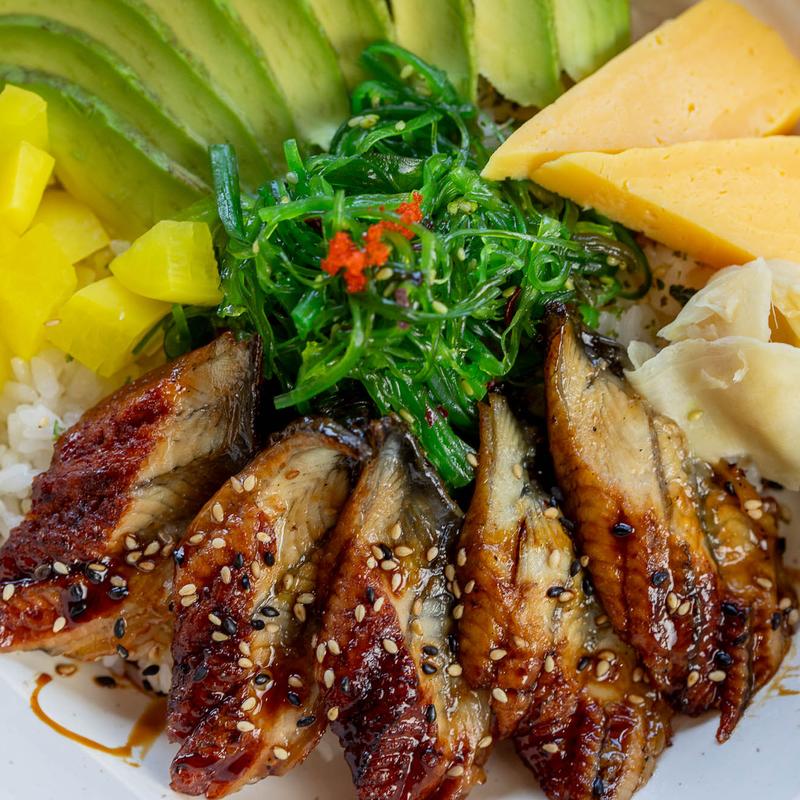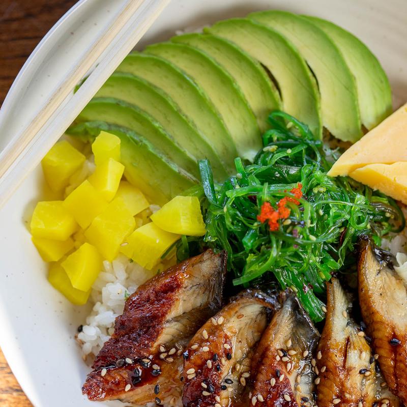Sushi rice topped with your choice of protein, oshinko, avocado, seaweed salad, and severed with Miso Soup or Salad.
