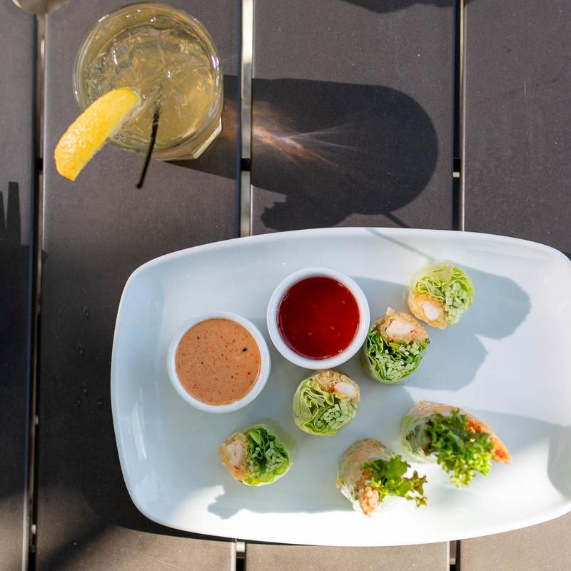 Cooked shrimp, crab, cream cheese, tamago, avocado, and lettuce, wrapped with rice paper.