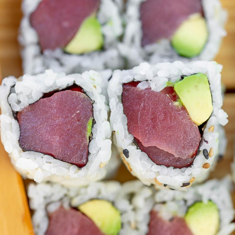 Shrimp tempura, cream cheese, and avocado topped with tuna, tempura flakes, and eel sauce.