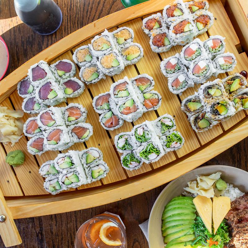 California roll topped with tuna, white tuna, salmon, yellowtail, and avocado.