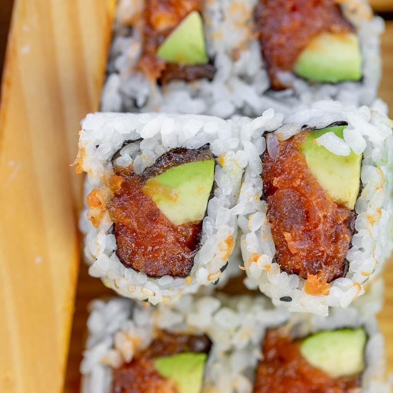 Spicy tuna, avocado, and cucumber topped with spicy salmon and tempura flakes.